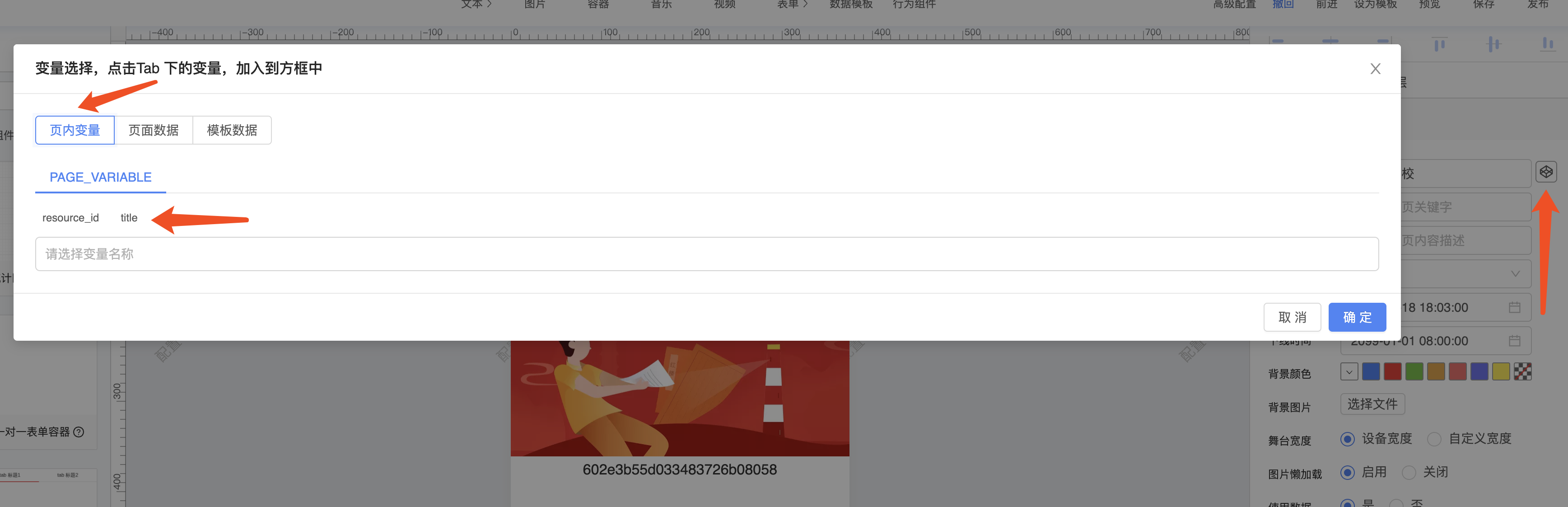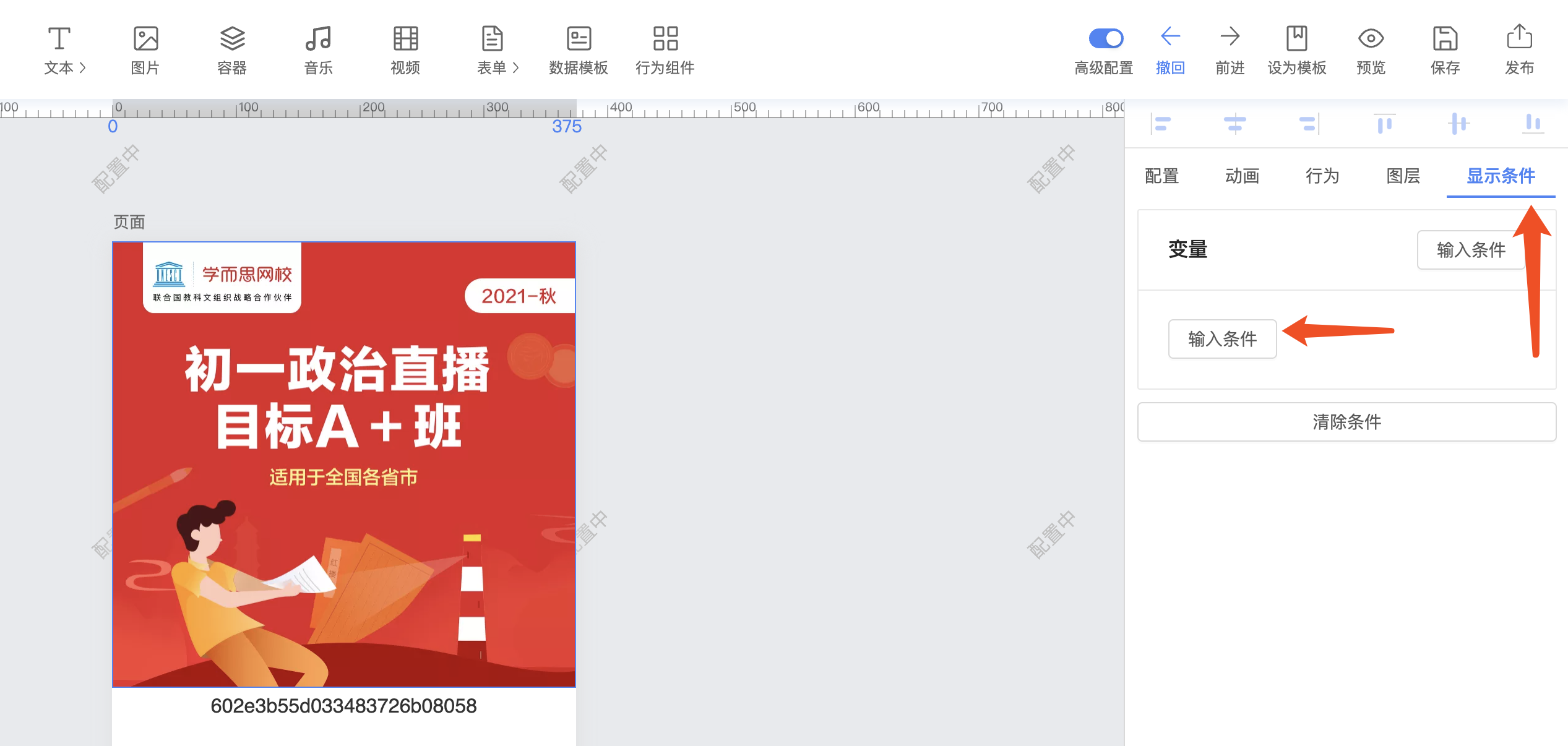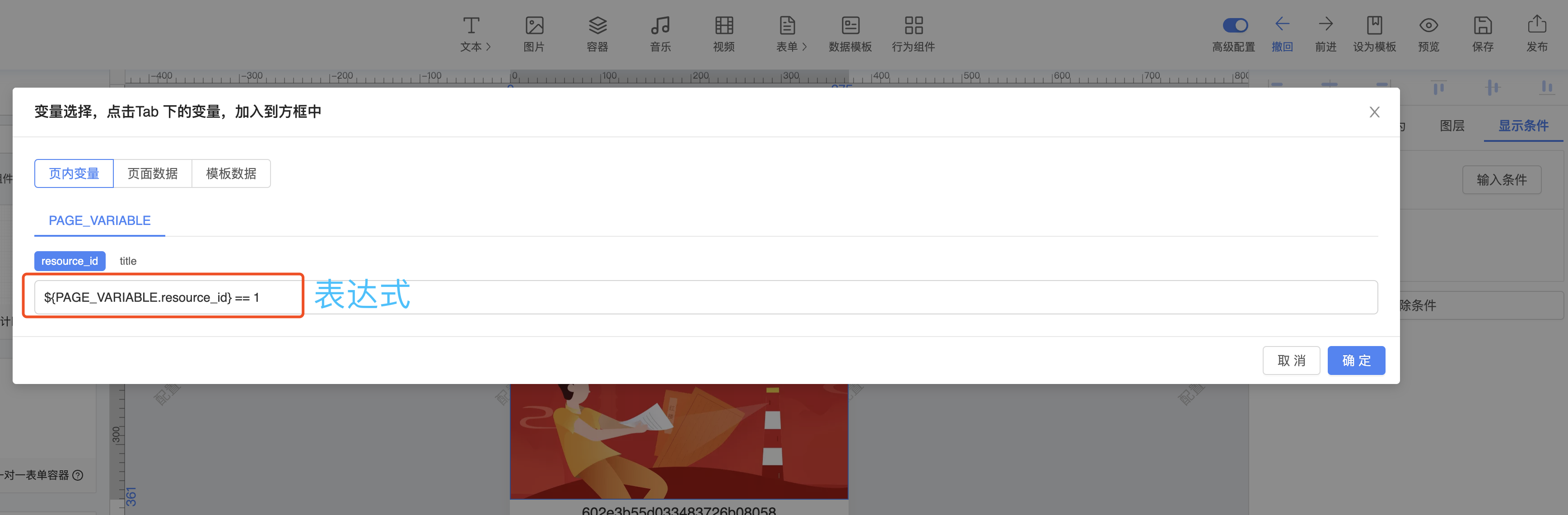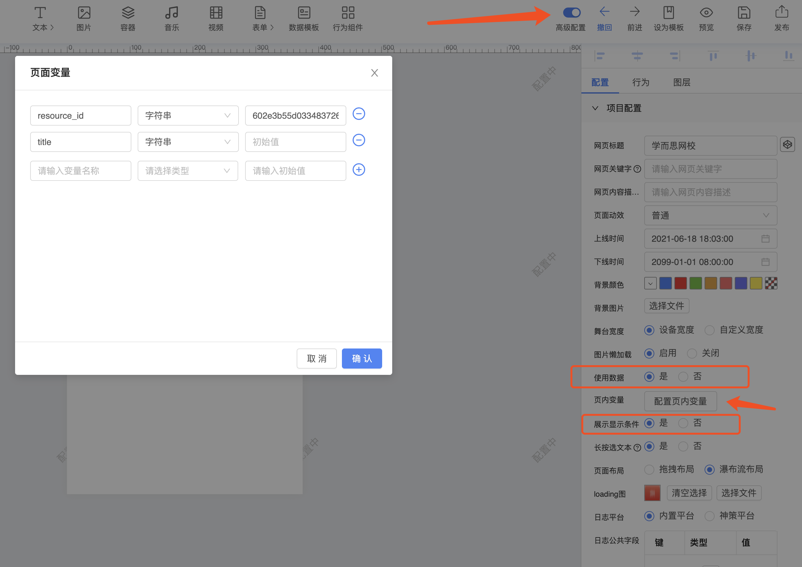 - 设置变量: 打开高级配置-打开使用数据-打开展示显示条件-点击配置页内变量